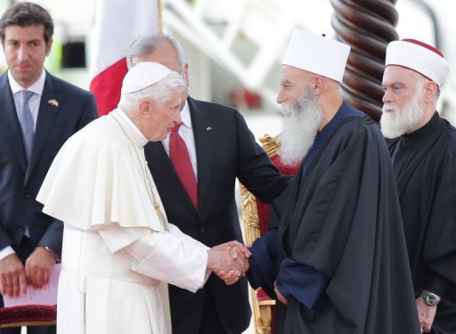 Pope Benedict XVI shake hands with the leader of the Lebanese Druzes, Beirut airport